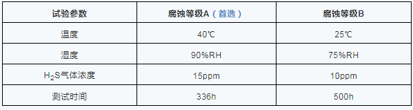 AEC-Q102车用光电半导体认证规范中的H2S气体腐蚀试验参考了IEC 60068-2-43标准,针对银和银合金的变色提供了加速试验方法。下面是可选择的两种腐蚀条件。