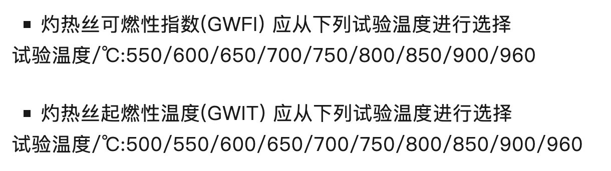 GWIT是指比连续三次试验均未引起试验样品起燃的灼热丝顶部最高温度高25K(900℃到960℃之间为30K)的试验温度。