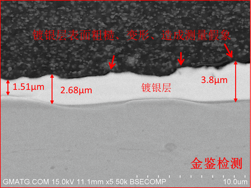 1. 镀层质量分析一位客户在光学显微镜下观察到镀银层表面存在凹坑。金鉴实验室通过氩离子抛光制样方法,发现凹坑位置的镀银层厚度偏低,从而确认凹坑与电镀质量相关。这一结果为生产工艺的改进提供了重要依据。