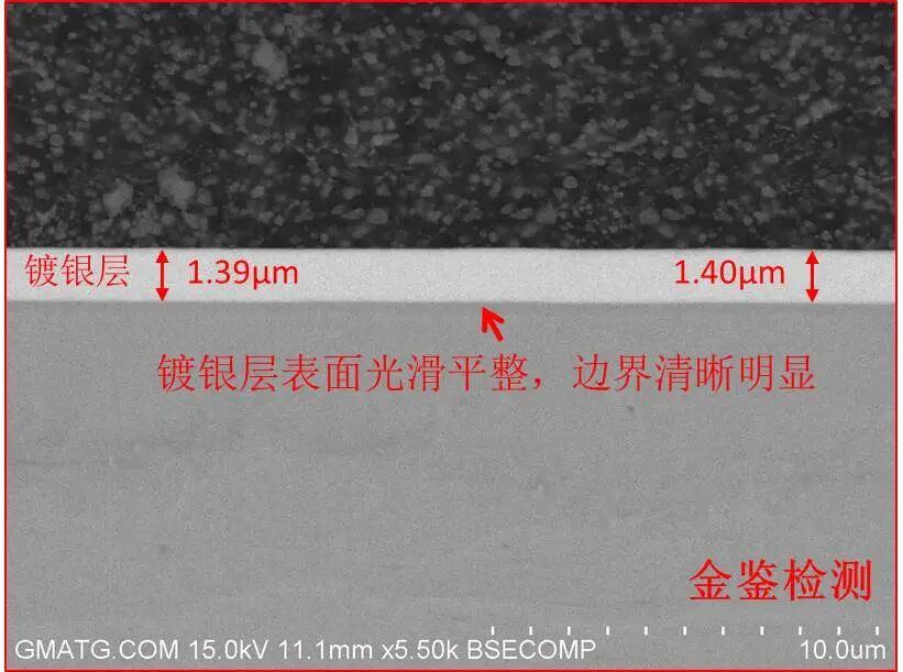 2. 镀层结构分析在另一案例中,客户反馈镀银层表面部分位置凸起。通过氩离子抛光后的截面分析,发现凸起位置下方的铜基材、镀铜层和镀镍层均存在凸起,且铜基材与镀铜层之间存在空洞。由此确认凸起的原因为铜基材异常导致。氩离子抛光技术不仅清晰地展示了镀层结构,还帮助客户准确地定位了问题根源。