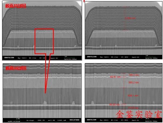 金鉴实验室FIB-SEM产品工艺异常或调整后通过FIB获取膜层剖面对各膜层检查以及厚度的测量检测工艺稳定性。