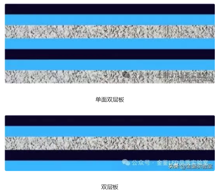 2. 双面线路铝基覆铜板有两层导电图形层与绝缘材料加铝板(基板)叠加在一起。