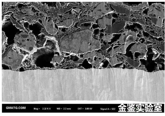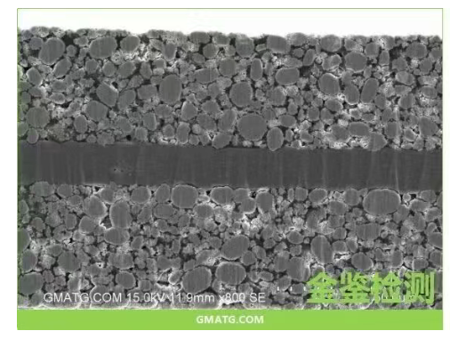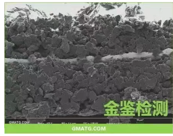 1.石墨极片的氩离子抛光截面制样某石墨生产厂家委托金鉴实验室对其石墨极片进行氩离子抛光截面制样。通过氩离子抛光技术,可以清晰地观察到电极材料涂片的内部结构。抛光前,由于样品是用剪刀剪切而成,截面上的损伤层较大,无法看清真实的内部结构。金鉴实验室拥有专业的氩离子抛光切割设备和技术团队,能够确保制样的准确性和可靠性。而经过金鉴实验室氩离子抛光后,损伤层被完全去除,内部结构清晰可见,孔隙度也能够准确测量,从而为材料的吸液性和寿命分析提供了可靠依据。