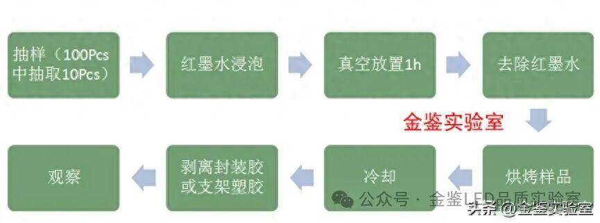 2. 红墨水渗透过程:将灯珠置于装有红墨水的滴管中,放入抽真空机中进行真空处理,以增强红墨水的渗透能力,并在真空机中静置1小时,确保红墨水充分渗透。金鉴实验室利用专业的实验设备和严谨的操作流程,确保实验条件的一致性和准确性。