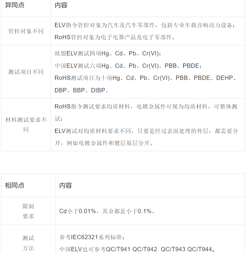 在测试项目上,欧盟ELV主要测试四项物质(Hg、Cd、Pb、Cr(VI)),而中国ELV测试六项物质(Hg、Cd、Pb、Cr(VI)、PBB、PBDE),RoHS则测试十项物质(Hg、Cd、Pb、Cr(VI)、PBB、PBDE、DEHP、DBP、BBP、DIBP)。