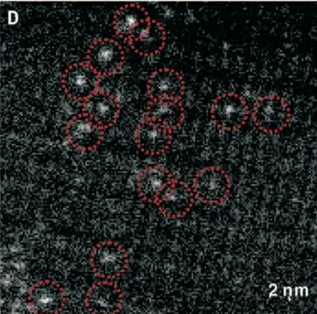 HAADF的作用是收集高角卢瑟福散射电子。为什么要收集高角散射电子?因为其产生的是非相关高分辨像,可避免TEM和HRTEM中复杂的衍射衬度和相干成像,从而能够直接反应原子的信息。什么时候用HAADF-STEM?最容易的答案就是:当您发现TEM和HRTEM仍然不能满足您的愿望时;在需要观察较细结构,较低浓度成分时;在需要进行线扫描时,HAADF-STEM同样被优先考虑。比如最近几年非常热门的单原子催化就只有用球差STEM才能较好地表征、找到这些单原子——图8。
