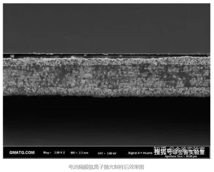 电池隔膜的氩离子抛光效果图显示了隔膜材料的精确结构,对于理解电池内部离子传输机制具有重要意义。图像中隔膜的孔隙结构和表面特性得到了清晰的展示,有助于评估隔膜的性能和耐久性。