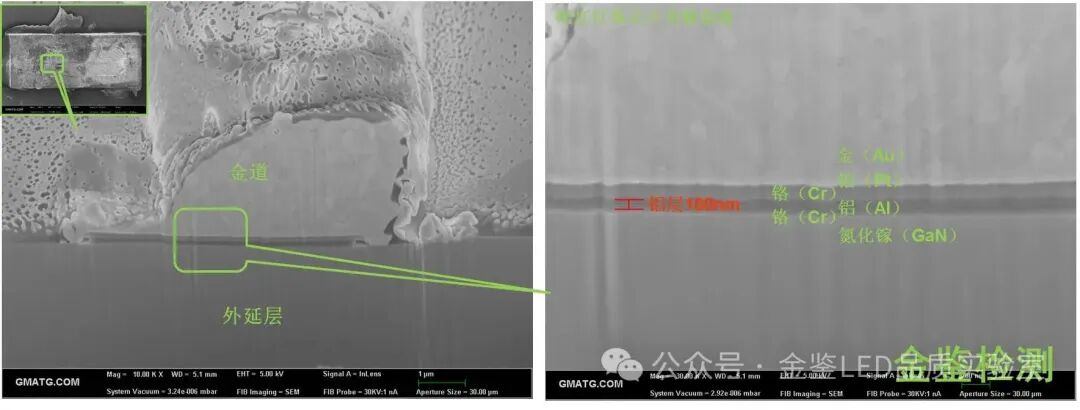 金鉴工程师对死灯灯珠芯片靠近负极电极烧毁位置下方的金道做FIB切割,结果显示芯片采用Cr-Al-Cr-Pt-Au反射结构,铝(Al)层与第1层铬(Cr)层结合良好。芯片负极的铝层厚度约为100nm。