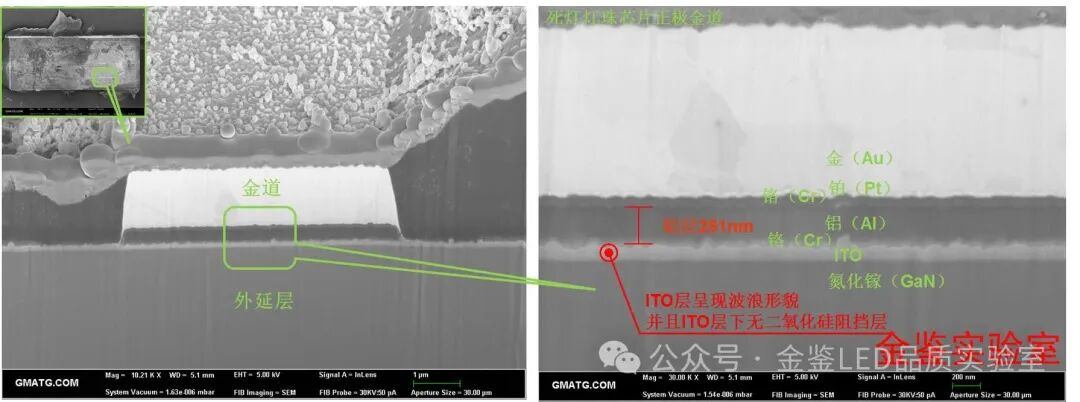 Cr-Al-Cr-Pt层呈现波浪形貌,尤其ITO层呈现波浪形貌,ITO层熔点较低,正极在高温下,芯片正极ITO-Cr-Al-Cr-Pt层很容易融化脱落,这也是金鉴观察到前面部分芯片正极脱落的原因。