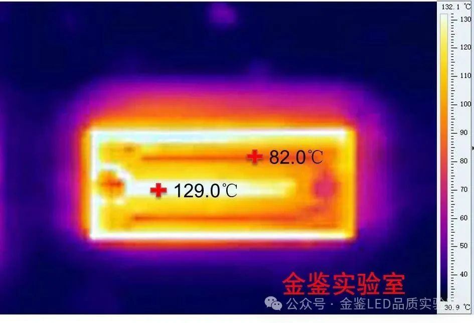 金鉴实验室拥有专业的芯片测试设备和技术团队,能够确保芯片测试的准确性和可靠性。使用金鉴自主研发的显微热分布测试仪对同样漏电芯片表面温度进行测量,发现芯片正负电极温度差距很大,数据显示如图负极电极温度为129.2℃,正极电极温度为82.0℃。