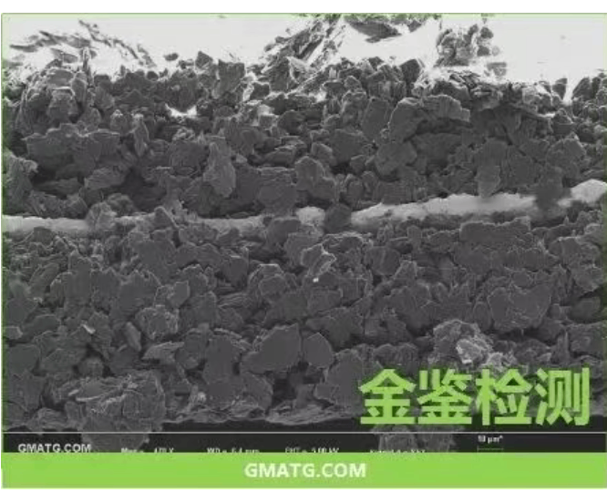 1.石墨极片的氩离子抛光截面制样某石墨生产厂家委托金鉴实验室对其石墨极片进行氩离子抛光截面制样。通过氩离子抛光技术,可以清晰地观察到电极材料涂片的内部结构。抛光前,由于样品是用剪刀剪切而成,截面上的损伤层较大,无法看清真实的内部结构。金鉴实验室拥有专业的氩离子抛光切割设备和技术团队,能够确保制样的准确性和可靠性。而经过金鉴实验室氩离子抛光后,损伤层被完全去除,内部结构清晰可见,孔隙度也能够准确测量,从而为材料的吸液性和寿命分析提供了可靠依据。