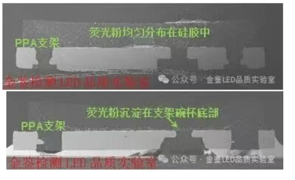 正常批次的LED灯珠剖面图,荧光粉均匀地分布在硅胶内,不良批次的LED灯珠剖面图,荧光粉沉淀在支架碗杯底部,这会造成色温偏差大、光斑不均匀、灯珠使用长时间后光衰等现象。