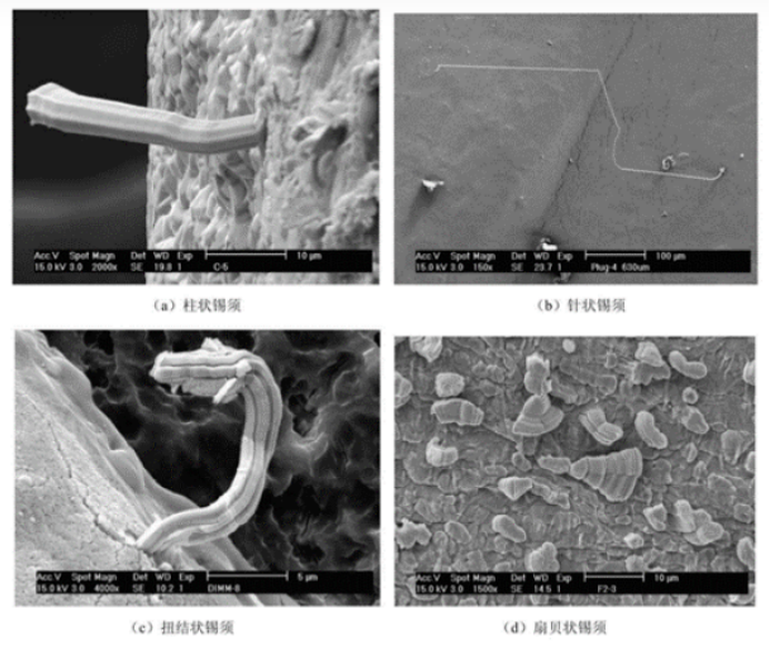 锡须的生长可以分为五个过程:Cu/Sn结合界面的原子相互扩散、晶界效应、压应力的产生、IMC层的持续生长和Cu6Sn5层反应减缓。锡须的生长可分为孕育期、快速生长期和低速生长至停止期三个阶段。