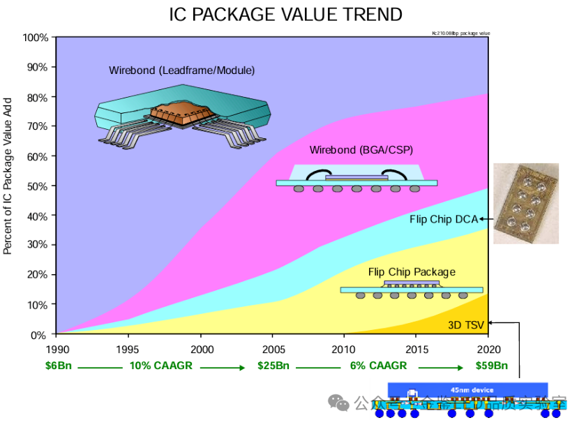 到上世纪90年代,以有机基板为载体的球栅阵列封装(BGA)逐渐成为主流。这种封装形式的出现,标志着封装技术从传统的引线框架向有机基板的转变。为了满足BGA封装初期的要求,引线键合技术不断创新,发展出了低弧线倒打、多层焊盘引线、堆叠芯片引线和多芯片间引线等技术,极大地提升了引线密度,从而推动了封装技术的进步。