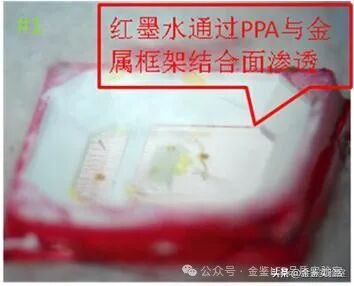 金鉴实验室在LED红墨水试验有丰富的经验及雄厚的实力,为国内众多公司客户提供LED红墨水试验检测服务。在对灯珠光源进行气密性验证时,金鉴实验室红墨水试验可以确认是否存在红墨水渗透现象及其渗透路径。实验样本大小为10pcs,实验1小时后可观察到1pcs光源出现红墨水从PPA与金属框架的结合面渗透入光源内部的现象,这一发现对于改进产品密封设计具有重要意义。