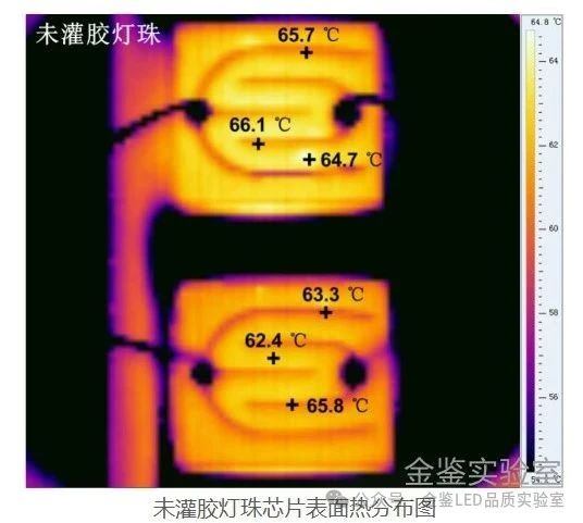 1.灌胶灯珠芯片结温高于未灌胶灯珠芯片结温