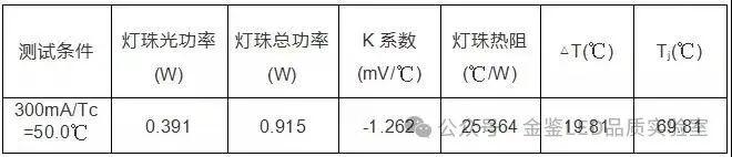 金鉴工程师根据该款灯珠实际使用时的参数,设置驱动电流为300mA,控制灯珠基板底部温度为50.0℃,此时控温槽温度Tc为50.0℃,下表为该条件下所测得的结果: