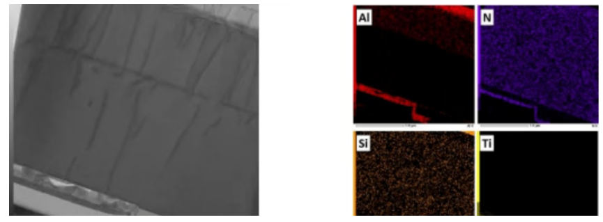 聚焦离子束技术在材料分析中的应用同样令人瞩目。以Si₃N₄复合材料的成分和结构分析为例,通过FIB技术,可以从选定部位对该多层材料进行切割提取并减薄处理,制备出适合TEM观察的样品。随后,结合能谱(EDS)分析材料各层成分,通过特定部位的高分辨分析确定其结构特点,并利用选区电子衍射确定基底相结构,通过双束衍射分析材料缺陷特征。分析结果显示,材料基底为Si₃N₄,镀层主要由Al、N、Ti组成,其中Si突起处的中间层主要由Al、Ti组成,呈现出尺寸约10nm的纳米晶多晶结构。此外,基底中存在较多的位错,且基本垂直于基底与镀层界面。