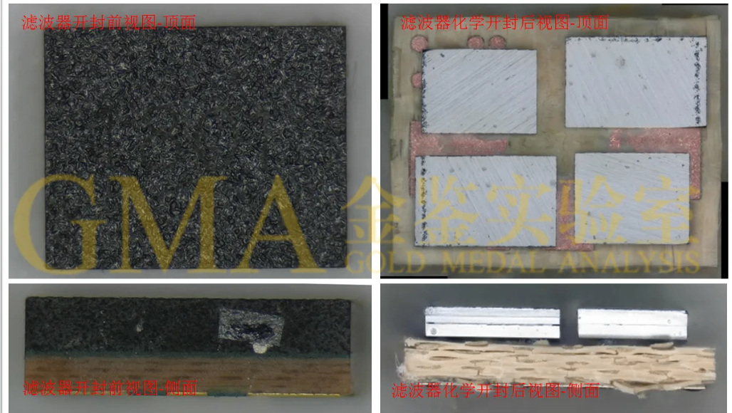 2.客户送测滤波器,化学开封后可清晰看到四个芯片的状态,有利于进行下一步分析。