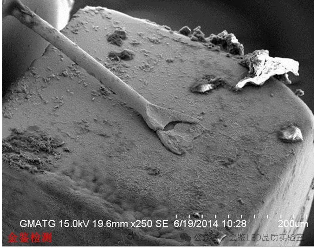 金鉴将失效灯珠溶管后在扫描电镜下观察,二焊鱼尾断裂,鱼尾与支架几乎没有接触,存在虚焊现象。