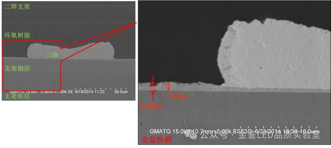 金鉴在扫描电镜下观察到到二焊支架镀银层过薄并厚薄不均,厚的镀银层约1.32um,薄的镀银层只有0.56um。镀银层过薄及厚薄不均易引起焊点附着力不强,与支架脱离,造成LED死灯。金鉴实验室的专业服务不仅限于测试和认证,还包括失效分析、技术咨询和人才培养,为客户提供一站式的解决方案,金鉴将继续秉承着专业的服务态度,不断提升自身的技术水平和服务质量,为LED行业贡献我们的力量。