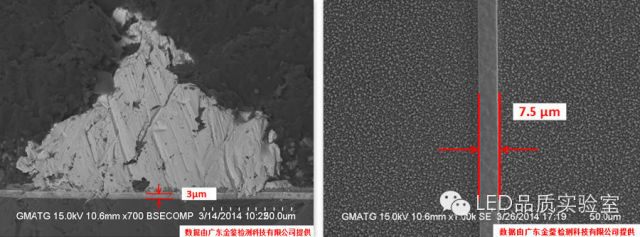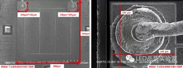 深圳某采购商送测灯珠样品,希望金鉴实验室可以查找出灯珠芯片的生产厂家和型号,确定是否与供应商的宣传信息一致。金鉴对样品开封,用扫描电镜测量芯片的尺寸。