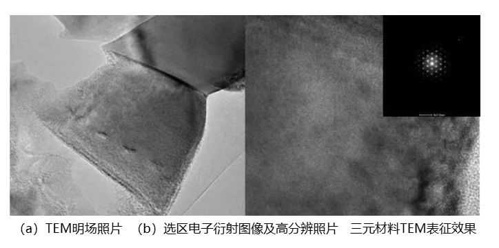 (a)TEM明场照片 (b)选区电子衍射图像及高分辨照片 三元材料TEM表征效果
