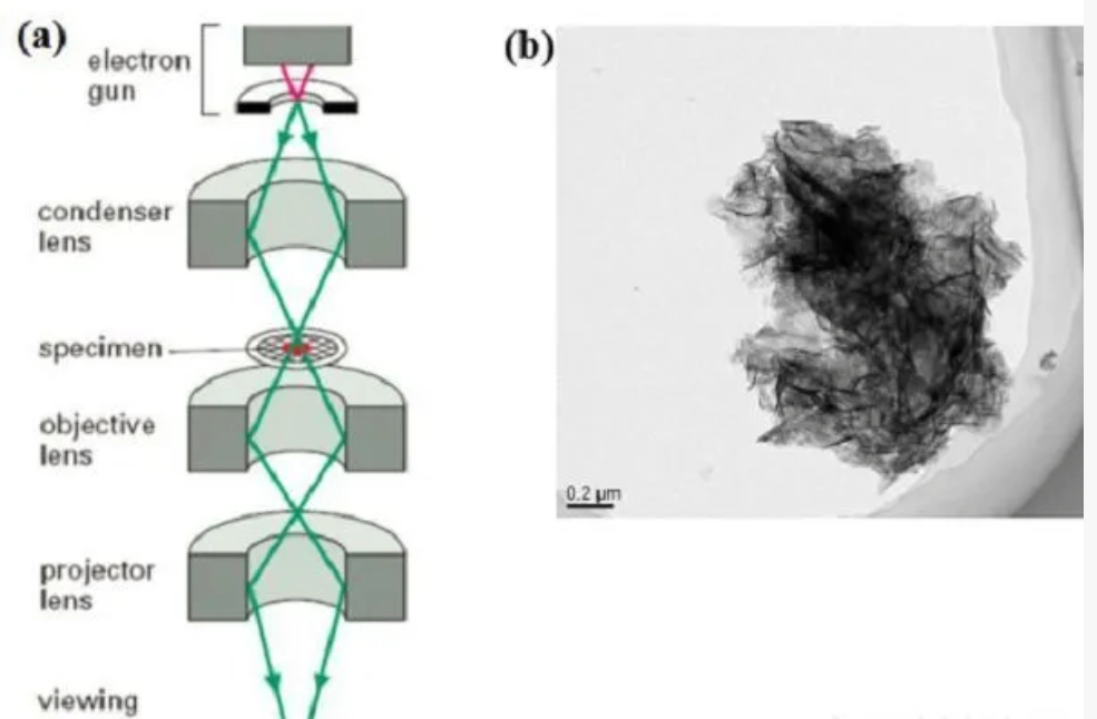 (a)TEM 透射电镜的结构原理图;(b)TEM测试照片(Co3O4纳米片)