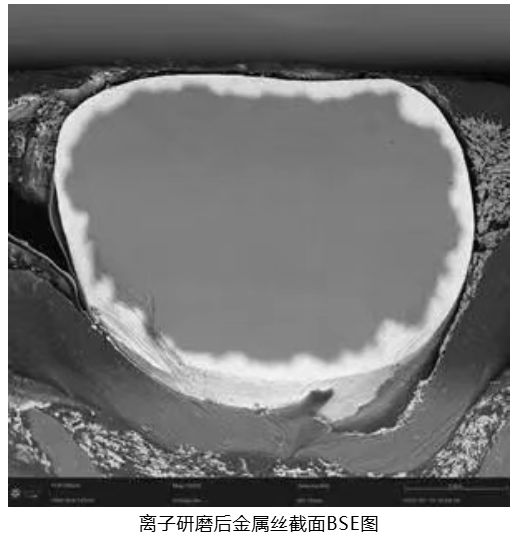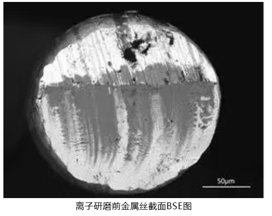 以金属丝样品为例,该样品包含铂(Pt)和镍(Ni)两种成分。在未进行离子研磨前,扫描电镜下的形貌显示,虽然可以分辨出亮度高的Pt元素和亮度低的Ni元素,但两种成分之间并没有明显的界限,且样品表面存在污染物,这可能会影响Pt和Ni的定量分析。