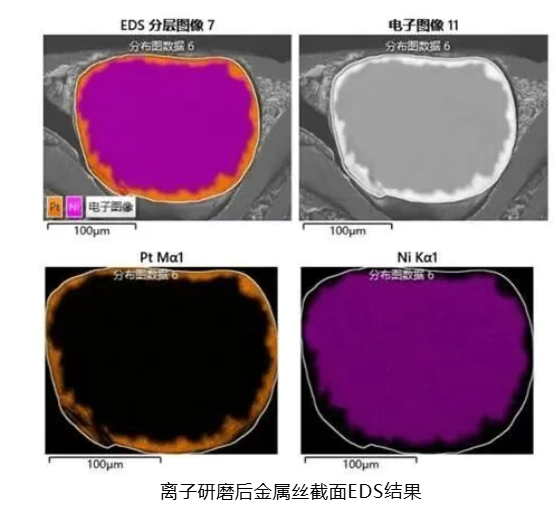 经过离子束研磨后,样品的截面结构得到了显著改善。电镜结果显示,样品表面平整、干净无污染,且Pt和Ni两种成分有明显的分界。通过EDS结果进一步证实了样品由Pt和Ni两种元素组成,其中Ni位于样品中间,而Pt位于样品边缘。金鉴实验室具备专业的EDS设备,能够为客户提供高标准的试验服务。