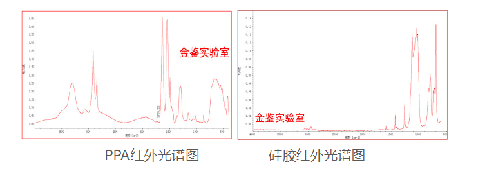 显微红外光谱分析技术结合了红外光谱分析和显微镜技术,通过红外光照射样本,样本分子吸收光能后转化为振动和转动能量,形成红外吸收光谱。该光谱中每个特征吸收峰对应样本分子中的特定基团和化学键,通过与已知光谱的对比,实现材料的鉴定。金鉴实验室运用Miro-FTIR技术,特别适合于分析微小量的有机污染物,帮助客户及时诊断腐蚀或焊接质量问题。以下是金鉴实验室工程师测试PPA及硅胶材料所得的红外光谱图。