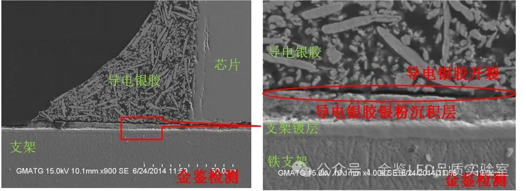 金鉴对灯珠解剖分析发现导电银胶存在开裂分层现象