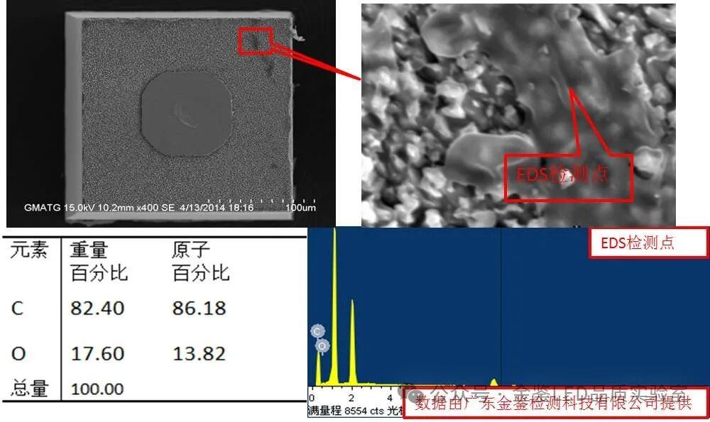 案例分析(一)某客户红光灯珠发现暗亮问题,但一直找不出原因,委托金鉴实验室分析失效的原因。金鉴经过一系列仪器分析排除封装原因后,对供应商提供的裸晶进行检测,发现每一个芯片的发光区域均有面积不等的污染物,能谱分析结果显示该污染物包含C、O两种元素,表明污染物为有机物。金鉴建议客户注重对芯片厂商的生产工艺规范和车间环境的考核,并加强对芯片的来料检验。