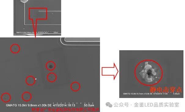 案例分析(二)某客户生产的一批灯珠出现漏电问题,委托金鉴实验室查找原因。金鉴通过扫描电镜鉴定这批灯珠漏电原因为静电击穿,并对供应商提供的裸晶进行检测,发现芯片外延层表面有大量黑色空洞,这些缺陷表明外延层晶体质量较差,PN结内部存在缺陷。空洞的发现,帮助客户明确责任事故的负责方,替客户挽回损失。