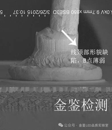 瓷嘴选择是否合适,对植球后的球形貌和键合质量至关重要。若金线线径与瓷嘴孔径未恰当匹配,会导致植球后线颈部损伤或缺陷,进而影响接强度。在冷热冲击测试或实际使用中,这些缺陷可能导致B点疲劳失效,最终造成电气连接回路虚接触甚至开路,引发灯珠闪烁或死灯。某封装厂生产的LED灯珠在老化阶段出现大量死灯现象,经金鉴的检测分析,发现是由于瓷嘴选用不当导致焊线后缩径现象严重,最终通过合理的评估和建议解决了问题。