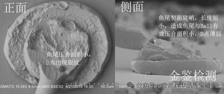瓷嘴选择是否合适还对切线形成鱼尾的质量也有着至关重要的影响。某封装厂LED产品老化后出现大量死灯现象,委托金鉴进行分析。我们将样品开封后对二焊点观察,发现二焊点存在引线连接隐患:鱼尾压合面积小,D点有裂纹。对焊点侧面观察,发现鱼尾契面陡峭,长度短小。综合判定,我们认为出现这种现象极有可能为所使用瓷嘴规格不恰当(如瓷嘴outside radius过大)或瓷嘴寿命管控不当等原因造成二焊点切线后鱼尾契面角度大,过渡不平滑,并导致鱼尾压合面积小,D点连接强度低。因此,我们建议客户对所使用瓷嘴作进一步检测和评估。