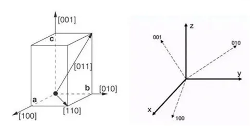 晶体取向是组织结构研究中的一个核心概念。晶体取向描述的是晶体中晶胞的特定方向与空间坐标轴之间的相对位置关系。晶胞是晶体结构的基本单元,通过三个坐标轴来表示,通常用晶向指数(如100、010、001)来表示。