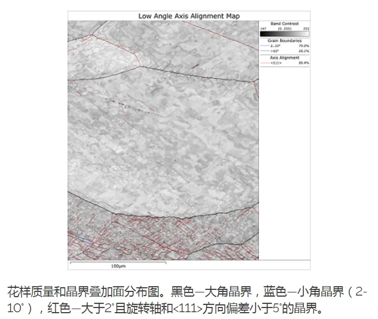 3. 晶粒特征:EBSD取向面分布图提供了晶体学取向的空间分辨信息,从中可以推导出严格的晶粒尺寸和形状。这些信息包括晶粒大小、晶粒形状/形貌、晶粒平均取向、晶粒内部取向变化和孪晶比例。