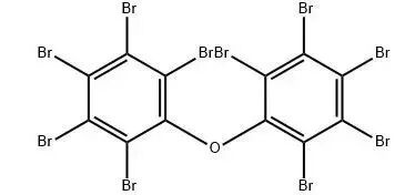 十溴二苯醚是一种高效广谱阻燃剂,广泛应用于橡胶、塑料、纤维等材料。它具有良好的阻燃性能,但由于存在污染性问题,其使用受到一定限制。其结构式为: