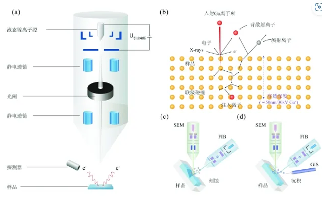 聚焦离子束技术的核心在于利用高能离子束对样品进行加工和分析。其基本原理是将镓(Ga)等元素在强电场的作用下加速,形成高能离子束。通过精确控制电场和磁场,离子束能够聚焦到样品表面,并按照设定的路径进行扫描。当高能离子束轰击样品表面时,会产生两种重要的现象:一是样品表面的原子被溅射出来,从而实现对样品的加工;二是会产生二次电子,这些二次电子被检测器捕获后,可以用于成像和分析。FIB 的这种工作原理使其具有极高的精度和灵活性。它可以对样品进行纳米级的加工和分析,能够清晰地观察到微观结构的细节。与扫描电子显微镜(SEM)类似,FIB 也利用聚焦束对样品进行扫描,但 FIB 使用的是离子束,而 SEM 使用的是电子束。离子束的能量更高,因此 FIB 在加工能力上具有独特的优势。