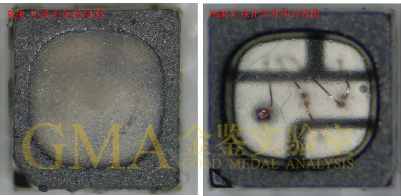 1.客户送测RGB SMD LED灯珠,通过金鉴实验室化学开封后可清晰看到键合线的状态。
