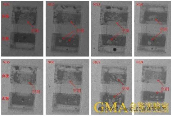 委托单位送测MiniLED灯珠进行X-RAY检测,排查倒装芯片是否存在焊接缺陷,结果显示芯片焊接存在空洞异常,其中负极焊盘的空洞比正极更为显著。金鉴实验室在X-RAY检测方面具有丰富的经验,实验室拥有一支由国家级人才工程入选者和资深技术专家组成的团队,能够针对MiniLED倒装芯片焊接缺陷检测提供具体的解决方案。