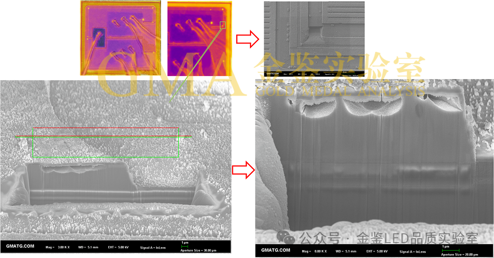 存在缺陷或性能不佳的半导体器件通常会表现出异常的局部功耗分布,最终会导致局部温度增高。金鉴显微红外热点定位系统利用新型高分辨率微观缺陷定位技术进行热点锁定(lock in) ,可快速而准确地探测细微缺陷(异常点)位置。对热点进行FIB切割分析后,可以观察到此发热点金属化薄膜铝条被熔断。