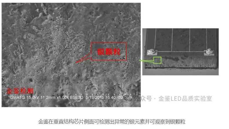 某客户用硅胶封装,导电银胶粘结的垂直倒装光源出现漏电现象,委托金鉴实验室查找原因。金鉴实验室拥有专业的漏电分析测试设备和技术团队,能够确保测试的准确性和可靠性。金鉴通过对不良灯珠分析,在芯片侧面检测出异常银元素,并可观察到银颗粒从底部正极银胶区域以枝晶状延伸形貌逐渐扩散到芯片上部P-N结侧面附近,因此金鉴判定不良灯珠漏电失效极有可能为来自固晶银胶的银离子在芯片侧面发生离子迁移所造成。