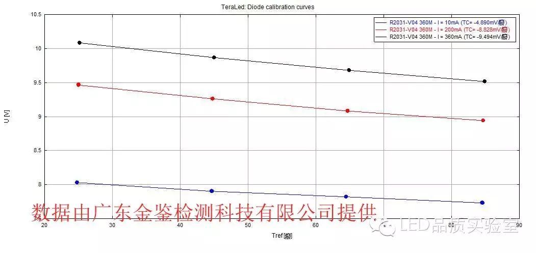 由上图可见,随着温度的上升,该样品LED的电压呈线性递减。