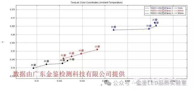 由上图可知,随着温度的上升,该样品LED的色坐标会往高色温方向漂移。金鉴实验室的专业服务不仅限于测试和认证,还包括失效分析、技术咨询和人才培养,为客户提供一站式的解决方案,金鉴将继续秉承着专业的服务态度,不断提升自身的技术水平和服务质量,为LED行业贡献我们的力量。