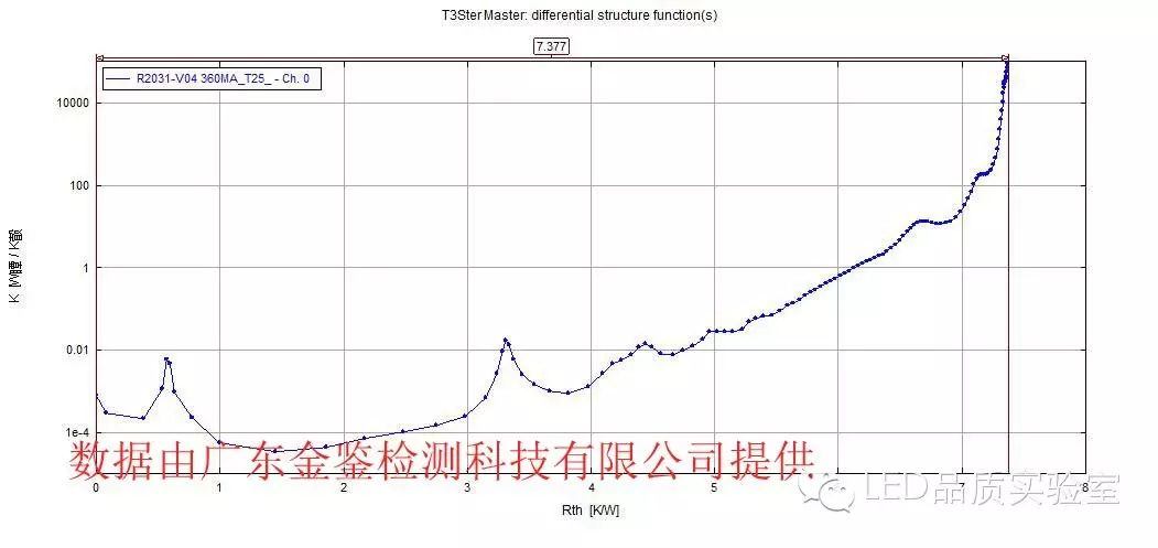 金鉴实验室根据测试,可以得出如下述的热阻曲线图,可读出测试产品总热阻(整个散热路径)为7.377K/W。该方法测试出的热阻需根据测试样品的结构,判定曲线中的热阻分层,获得封装器件的准确热阻。该方法更适合SMD封装器件。金鉴实验室拥有专业的LED测试设备和技术团队,能够确保LED测试的准确性和可靠性,如需进行专业的检测,可联系金鉴检测顾问189-2421-3655。