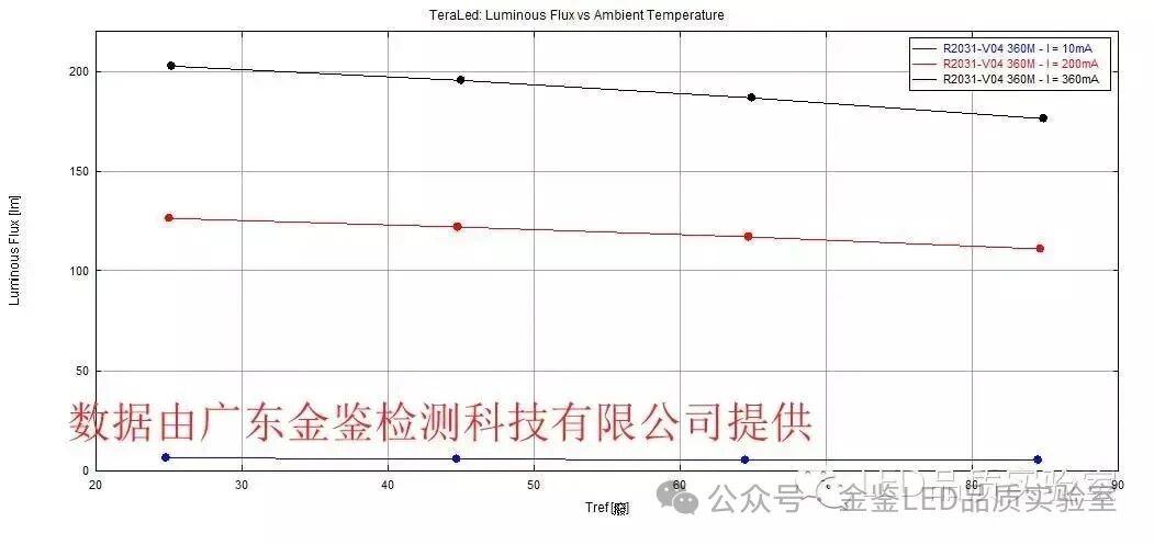 由上图可见,随着温度的上升,该样品LED的光通量呈线性递减。