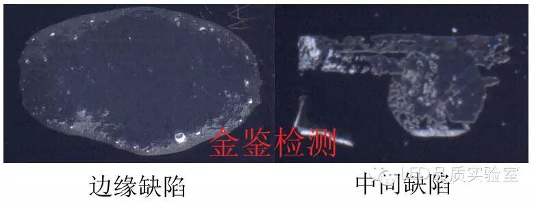 同批次产品,取固晶层完好、边缘缺陷以及中间缺陷的样品测试。固晶完好的固晶层应为矩形,而边缘和中间存在缺陷,则固晶层不规则,下图两种缺陷的图片。