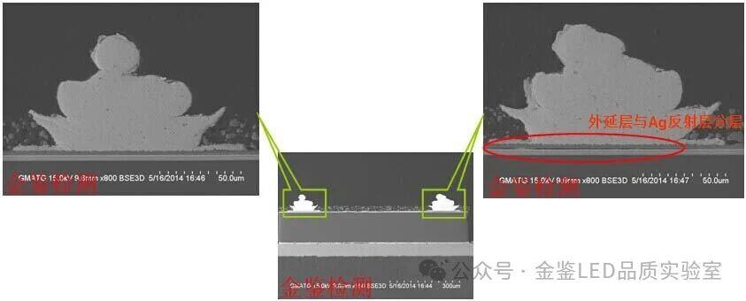 案例分析二:某大功率产品引线键合工艺分析金线与LED外延层键合良好,但是我们发现右边的电极处 Ag反射层与外延层附着力弱,有分层现象。